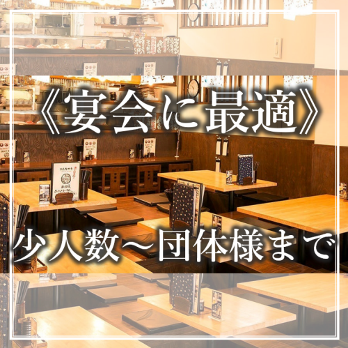少人数~団体様まで、どんなシーンでも大歓迎!活気ある広々とした店内に、テーブル席・掘りごたつ席を多数ご用意しております!歓迎会や送別会はもちろん、会社宴会、接待、女子会などなど、いつでも気軽に立ち寄れるのが魅力の海鮮食堂です!